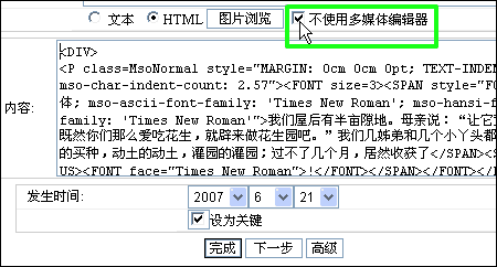 11.在勾選“不使用多媒體編輯器”時(shí),編輯狀態(tài)就是有代碼的樣子,這種狀態(tài)適合有一些HEML代碼基礎(chǔ)的用戶來使用,它的好處就是定位準(zhǔn)確、垃圾代碼少、占用資源小。使用方法就跟前面一樣,把標(biāo)題、作者添好,把代碼編寫好,點(diǎn)擊完成即可提交。