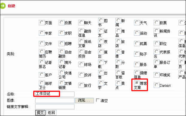 2. 進入“創(chuàng)建”頁面。選擇一個作為基礎(chǔ)類別的“類別”,填上新的名稱,圖片是用來表示該類別的,“鏈接文字解釋”是對該類別的一個注釋。