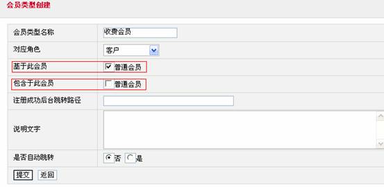 會員類型名稱可以任意填寫,在這里我們填寫的是普通會員,可以設(shè)置該會員擁有的角色,設(shè)置注冊成功是否跳轉(zhuǎn)和跳轉(zhuǎn)的路徑以及說明文字,另外還有基于此會員和包含于此會員的選擇,因為普通會員是我們創(chuàng)建的第一個會員類型所有此兩項都沒有記錄。