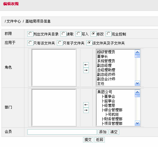 3. 可以設置文件管理的角色,這里為了方便說明,只添加了兩個角色,而且角色的分配可以是多個的,如下圖:我們可以給超級管理員這個角色賦予此權(quán)限,也可以把總經(jīng)理也添加到此列中,此時,就角色而言,超級管理員和總經(jīng)理的權(quán)限相同;