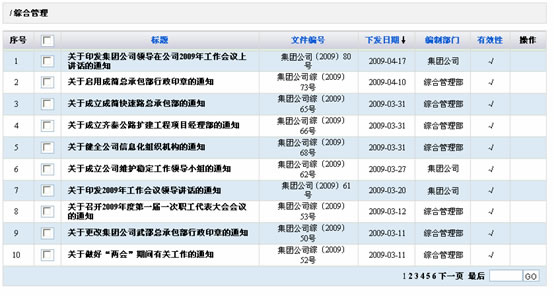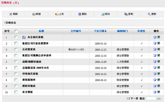 功能介紹:用戶可以查看到對應欄目下的文件的主題、編制部門、下發(fā)日期、文件編號等信息,并根據(jù)權(quán)限下載或上傳相關(guān)文件或?qū)ξ募r行修改。