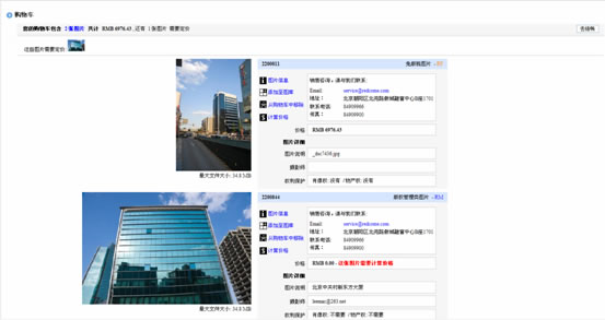 購物車中的圖片只有全部計(jì)算完價(jià)格還可以點(diǎn)擊右上角的 按鈕進(jìn)行結(jié)賬,結(jié)賬后管理員進(jìn)行財(cái)務(wù)確認(rèn)后方能生成訂單并提供圖片的下載連接,可至3.1.2訂單和下載進(jìn)行查看,購物車具體操作和說明如下: