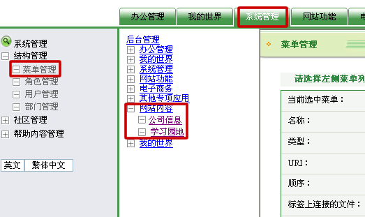 第一步: 用戶登陸到后臺界面,點擊“系統(tǒng)管理”按鈕,接著點擊左邊菜單欄中“菜單管理”,此時右邊出現(xiàn)后臺管理的菜單欄和菜單管理頁面;點擊后臺管理頁面中的“網(wǎng)站內(nèi)容”(即后臺桌面顯示的標(biāo)簽組);