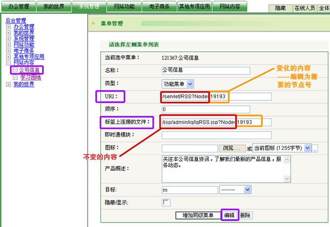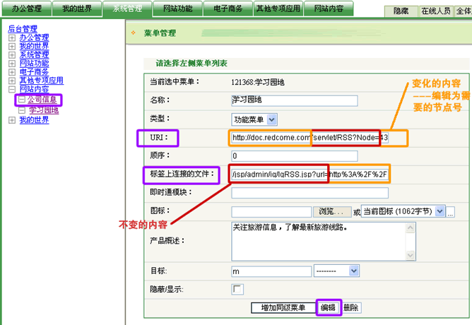 對其中的“URI”選項和“標(biāo)簽上連接的文件”選項進(jìn)行編輯,分別對應(yīng)的填入“/servlet/RSS?Node=***”和“/jsp/admin/ig/IgRSS.jsp?Node=***”;