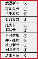 此菜單的功能主要是:用于當(dāng)用戶的卡由于各種原因丟失時,可以到店里進(jìn)行掛失處理,防止別人撿到時冒充消費,掛失后可以再補(bǔ)辦一張新卡(詳見[補(bǔ)辦新卡]),當(dāng)然,當(dāng)用戶找到原卡時還可到店里對卡進(jìn)行解掛,(詳見[解掛卡])。