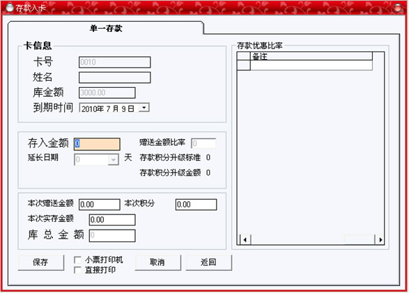 此菜單主要是為了給儲值卡用戶消費一段時間后,充值用的,發(fā)行新卡時類型為儲值卡,當(dāng)時沒有填入“庫金額”時,也可在此窗口來加入金額。