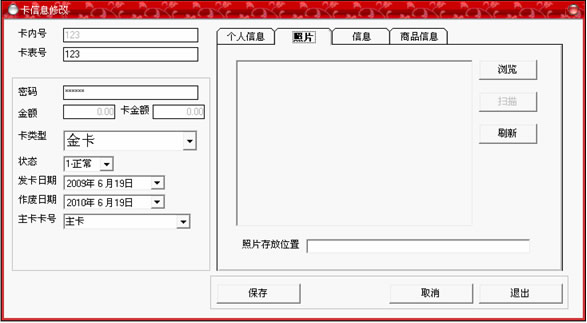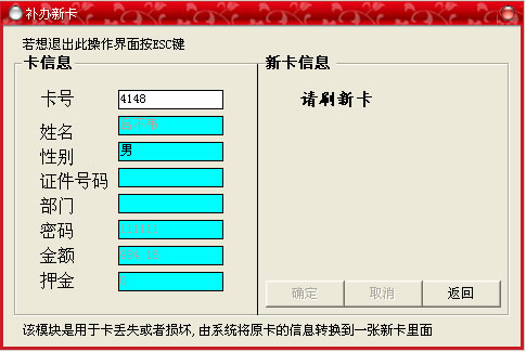 此窗口的功能主要是:當(dāng)發(fā)行的卡的一些信息輸入錯誤時,可以通過輸入卡號,調(diào)出關(guān)于此卡的所有信息,進(jìn)行修改,有時發(fā)行卡時未及時輸入個人信息時,也可以通過此窗口來補(bǔ)錄。輸入卡號后直接回車即可,然后當(dāng)修改完畢時,點擊保存后退出。
