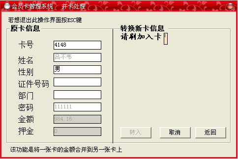 此菜單的主要功能是:將一張卡的金額合并到另外一張卡上,在進(jìn)行并卡處理之前一定要先將要并卡處理的卡進(jìn)行掛失操作,然后在出現(xiàn)的窗口中輸入要合并的卡號回車,提示輸入轉(zhuǎn)到的卡號然后回車,會出現(xiàn)如下的提示,點“確定”按鈕則合并成功,點“取消”按鈕,則取消本次操作,操作完畢點“返回”退出。