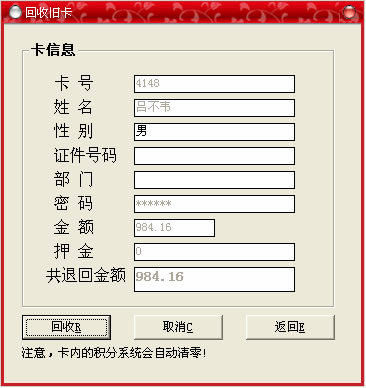 此菜單的功能主要是:減少卡中的金額,與“卡中存款”功能相反,在如下窗口,操作同〔卡中存款〕。