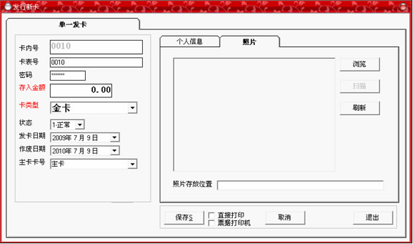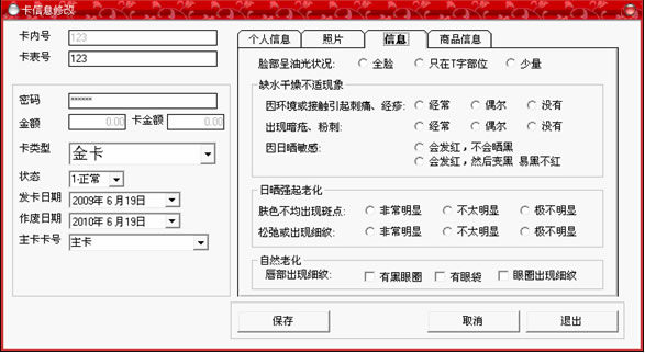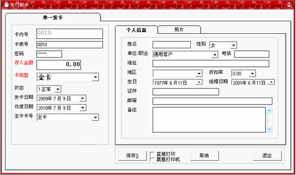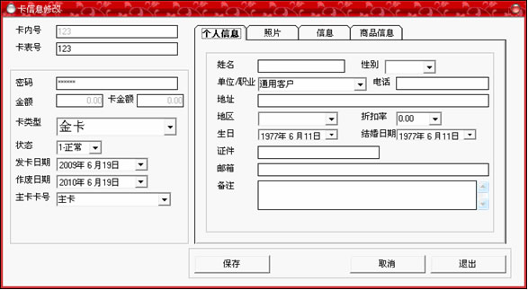 黑色,即可以輸入卡中所存入的金額,如果類型為會員卡,那么將顯示為灰色;在右邊的個人信息選擇中,可以詳細(xì)記錄持卡人的各種資料,全部填寫完畢后,點“保存”按鈕。