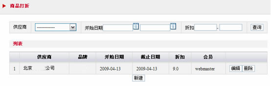 上圖是商品打折的添加,在這個頁面的上部是對商品打折的查詢,可以根據(jù)供應(yīng)商、開始日期、折扣進(jìn)行查詢,下面是添加后的列表,可以對添加好的進(jìn)行修改編輯和刪除,點擊下面的”新建”,可以看到下面圖片: