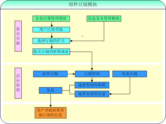 郵件訂閱模塊是EDN系統(tǒng)管理中的一個重要的模塊,與信息發(fā)布管理模塊、會員注冊管理模塊共同完成郵件訂閱功能。