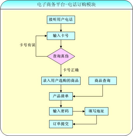 電子商務平臺-電話訂購模塊的功能與網(wǎng)上購物的功能有一定的差別,該功能目前只針對會員卡。顧客打進電話,呼叫坐席在我們的電話訂購功能里面輸入顧客的會員卡號、所購商品、郵寄地址。當訂單提交成功以后,系統(tǒng)數(shù)據(jù)庫中就會相應地扣除用戶所購商品的金額,當貨物送到以后,用戶需用會員卡在我們的手持終端刷卡,從卡中扣除相應的錢數(shù),此時,一次完整的電話訂購交易結(jié)束。