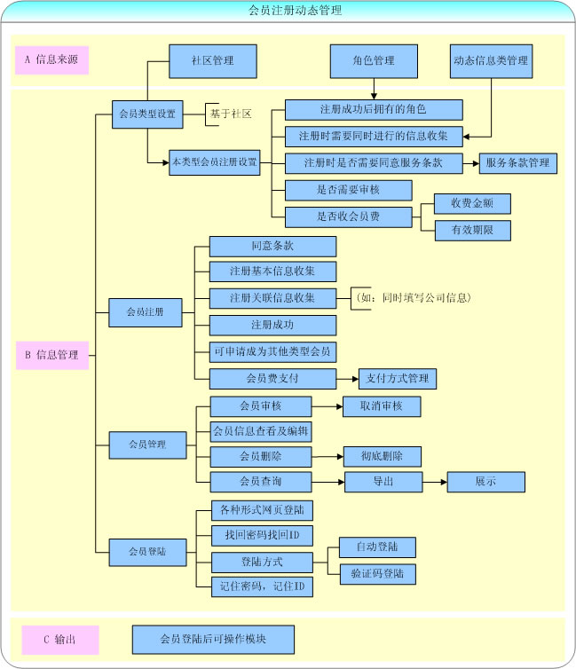 此功能模塊,可實現(xiàn)系統(tǒng)可注冊會員類型的預(yù)設(shè),會員注冊時各種選項的動態(tài)設(shè)置,會員費支付及支付選項控制,會員的審核,編輯刪除,會員各種形式的登陸及登陸后相關(guān)功能引導(dǎo)。