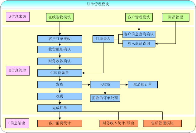 訂單管理模塊,從用戶購(gòu)買商品下單到訂單的確認(rèn),收款確認(rèn),到供貨,到訂單的查詢,是客戶購(gòu)買商品的訂單提交后的一系列管理工作流程.